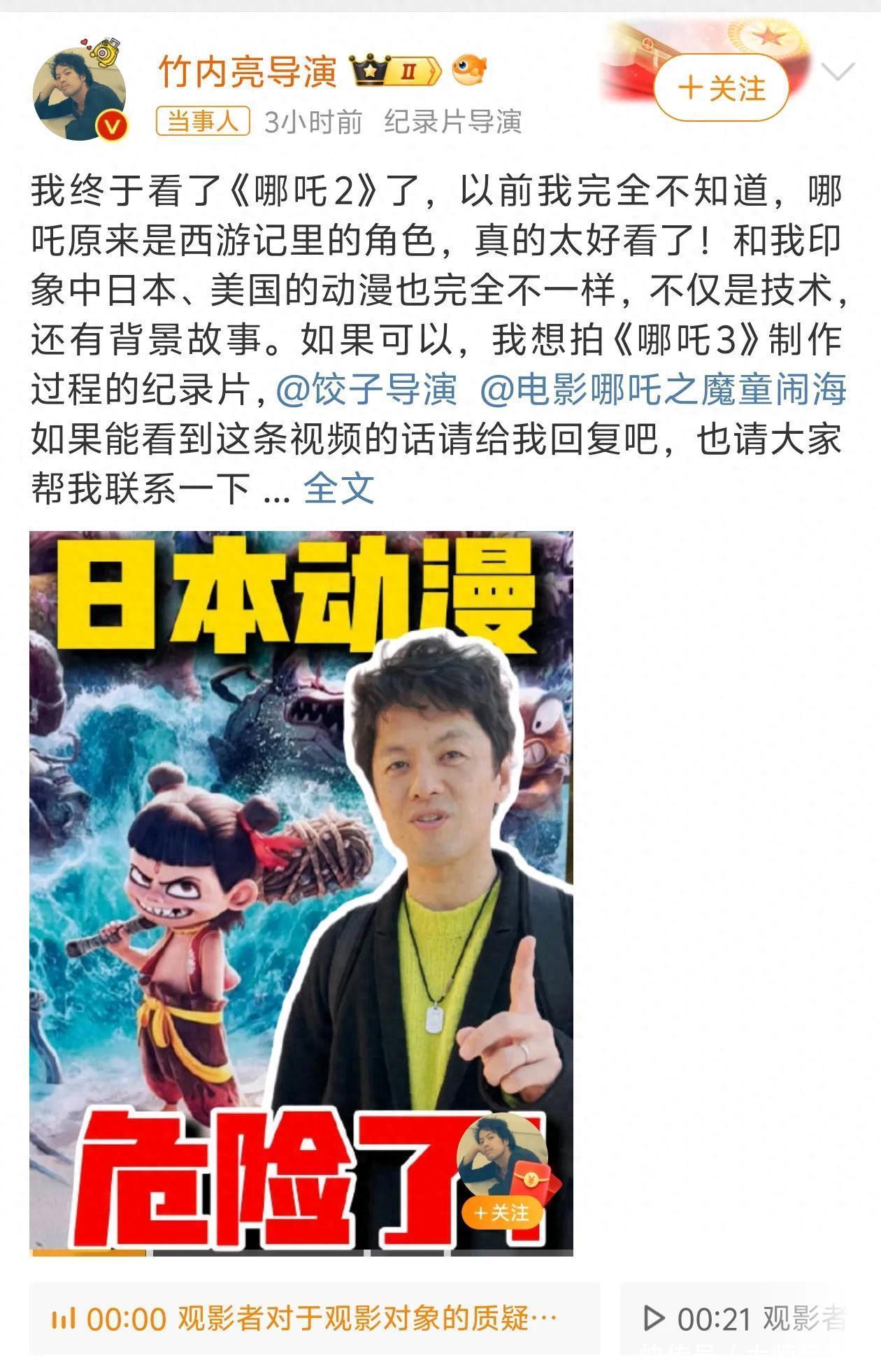 这不,竹内亮导演看完哪吒,忍不住在wb呼叫饺子导演:“太好看啦!如果可以,我想拍《哪吒3》制作过程的纪录片!”竹内亮还恳求网友也帮帮他,务必联系到哪吒官方寻求合作机会,看得出他真的爱得很热切了。